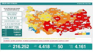 Üçüncü doz dahil aşı verilerinin eklendiği "Günlük Kovid-19 Tablosu"na göre son 24 saatte Türkiye'de 4 bin 418 kişinin Kovid-19 testi pozitif çıktı, 50 kişi yaşamını yitirdi.