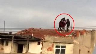 Bursa'da sosyal medya uygulaması Tiktok'a yüklemek için bir binanın çatısına çıkıp video çeken 3 genç kız, cep telefonu kamerasıyla görüntülendi.