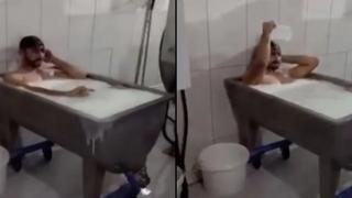 Üretim yapan bir süt fabrikasında, bir şahsın kazanın içine girerek süt banyosu yaptığı anlar kamera kaydına alındı. Çekilen görüntüler, eğlence amaçlı kullanılan sosyal medya platformunda paylaşıldı.