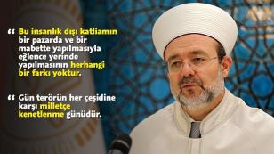 Diyanet İşleri Başkanı Görmez, "Yeni yılın ilk saatlerinde savunmasız insanlar üzerine hunharca yapılan silahlı saldırı, bütün milletimizi derinden yaralamıştır. Bu bir vahşettir, dehşettir, cinayettir ve katliamdır." dedi.
