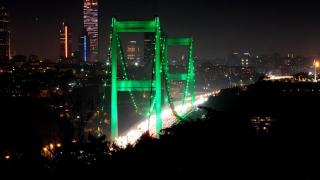 İstanbul'un simge noktalarından Fatih Sultan Mehmet (FSM) Köprüsü, İrlanda Milli Günü dolayısıyla yeşil renkte aydınlatıldı.