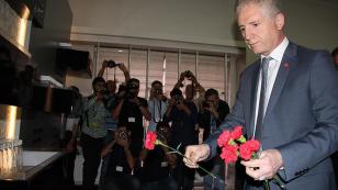 Sivas Valisi Gül ve Belediye Başkanı Aydın, 2 Temmuz 1993'te çıkan olaylarda yaşamını yitirenler için eski Madımak Oteli binasında oluşturulan anı köşesine karanfil bıraktı.