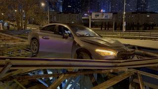 Üsküdar'da, bariyerlere çarpan otomobil köprünün üzerinde asılı kaldı.