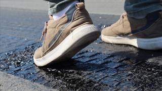 Denizli'de hava sıcaklığının 42 dereceye ulaşması nedeniyle bazı yolların zeminindeki asfalt eridi.