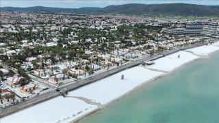 İzmir'in Çeşme ilçesinde etkili olan dolu nedeniyle plaj ve caddelerde ilginç manzaralar oluştu.