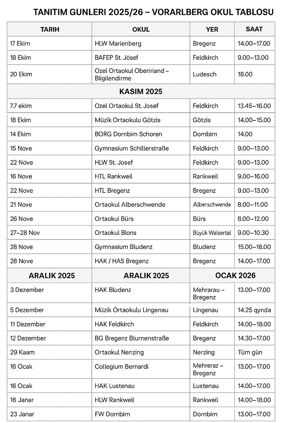 Vorarlberg’deki birçok okul, sonbahar ve kış döneminde düzenlenecek tanıtım günleriyle aileleri ve öğrencileri bilgilendirmeye hazırlanıyor. Ortaöğretim kurumları; fen, teknik, sosyal, ekonomi ve sanat alanlarında sundukları eğitimleri doğrudan tanıtacak.