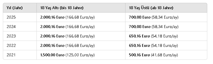 - Çocuğu 18 yaşından küçük olan aileler için yılda 2.000,16 Euro sağlar.