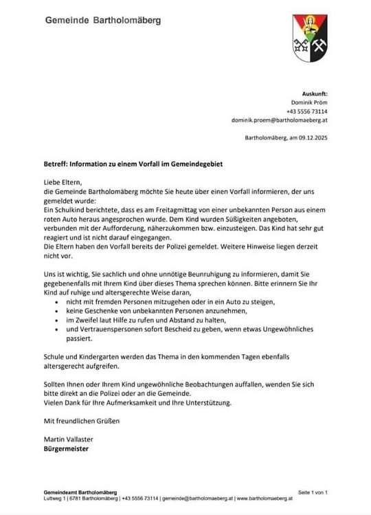 Bartholomäberg’de bir çocuğun, cuma günü öğle saatlerinde bir yabancı tarafından otomobilden seslenilerek durdurulmaya çalışıldığı iddia edildi. Çocuğun ailesi durumu güvenlik birimlerine bildirdi. Belediye ise olay üzerine halka yönelik bir bilgilendirme yazısı yayımladı.