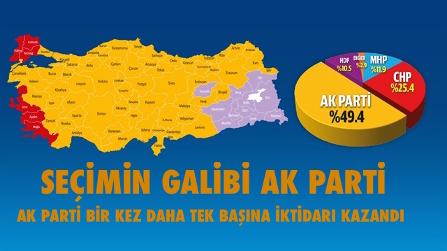 Resmi olmayan sonuçlara göre AK Parti, 2011 seçiminde aldığı yüzde 49,8'lik oy oranını yakalayarak yüzde 49,34'lük oy oranıyla tek başına iktidar olma hakkını kazandı.