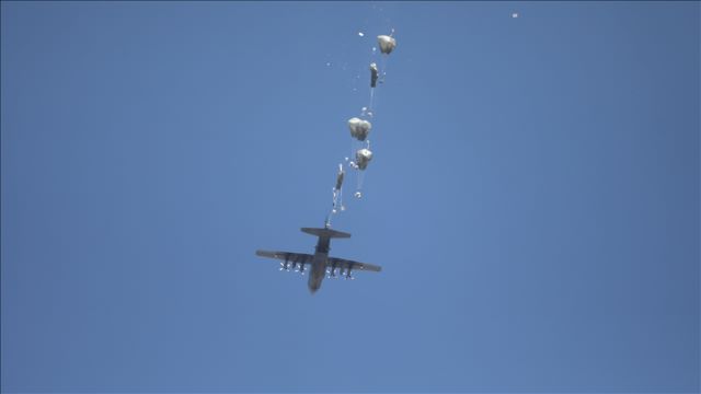 Almanya Savunma Bakanlığı'nın sosyal medya hesabından yapılan açıklamada, Alman Hava Kuvvetlerinin ilk kez bugün Gazze'ye paraşütle insani yardım malzemeleri indirdiği belirtildi.