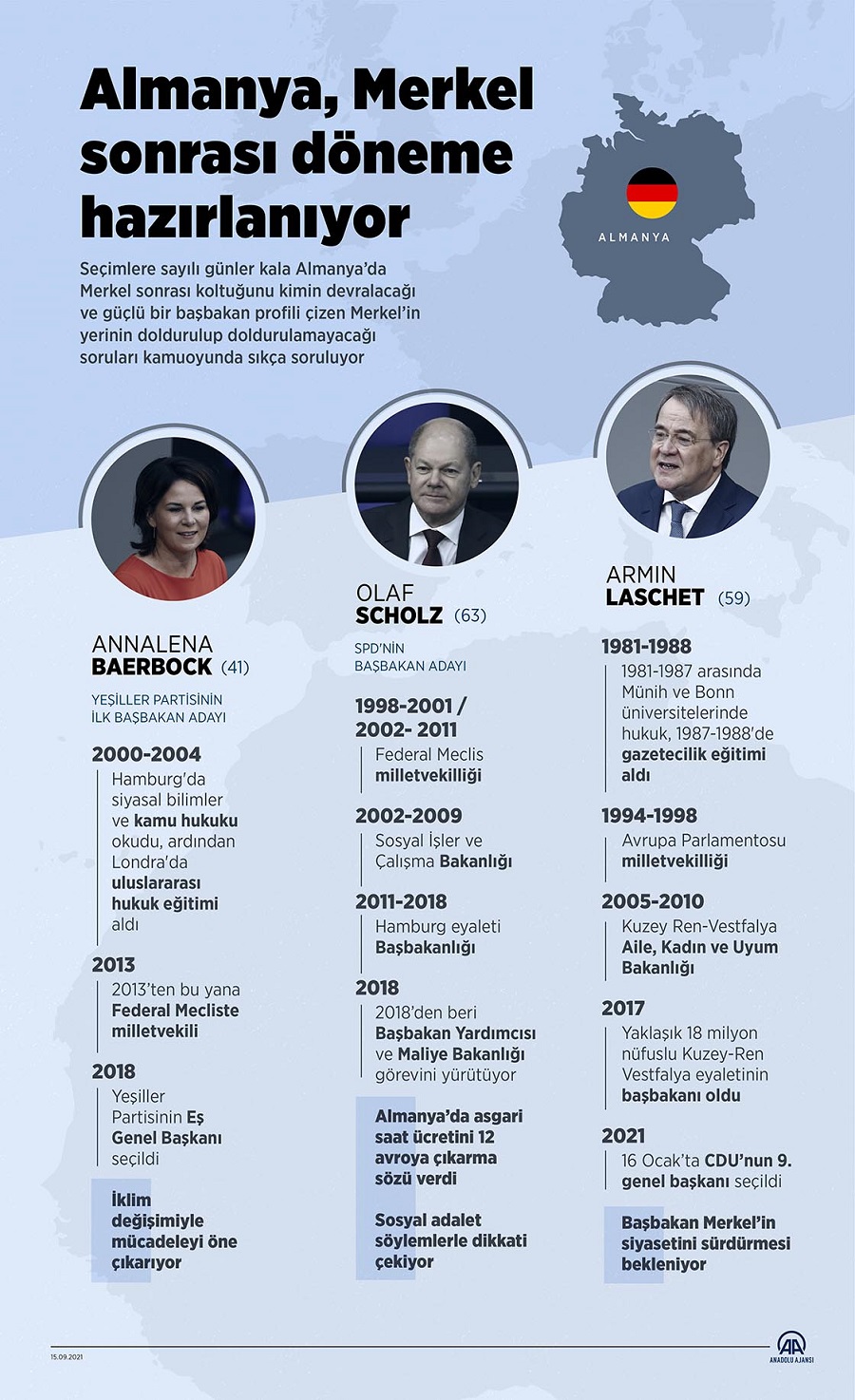 Seçimlerde Merkel'in koltuğu için Hıristiyan Demokrat Birlik Partisi (CDU) Başkanı Armin Laschet, Sosyal Demokrat Partili (SPD) Maliye Bakanı Olaf Scholz ve Yeşiller Eşbaşkanı Annalena Baerbock yarışacak.