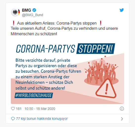 Almanya Sağlık Bakanlığı Twitter hesabından ilginç bir duyuru paylaştı. Bakanlık, "Lütfen özel partilere katılmayın veya özel partiler düzenlemeyin. Korona partileri yeni enfeksiyonların meydana gelmesine neden oluyor, kendinizi ve diğerlerini koruyun." ifadelerini kullandı.