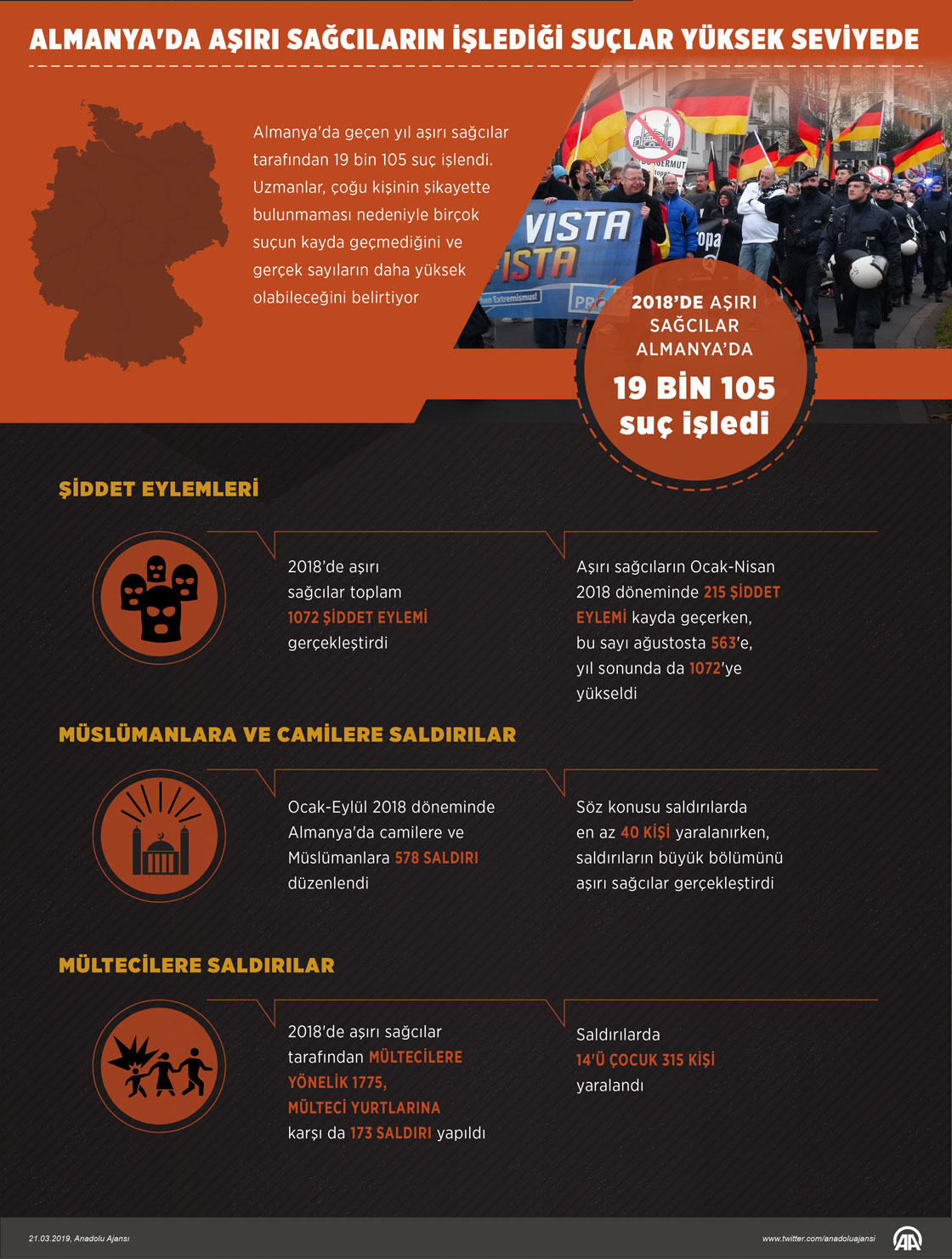 Aşırı sağcıların Almanya'da işlediği suçlara ilişkin sayı 2017'de 20 bin 520, geçen yıl ise 19 bin 105 oldu ancak konuya ilişkin nihai raporun mayıs ayında açıklanacak olmasından dolayı 2018'e yönelik rakamların geçen yıllardaki seviyelere ulaşabileceği ifade ediliyor.