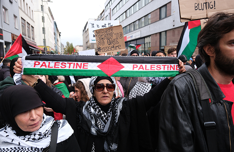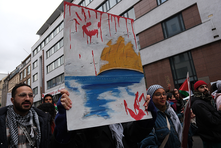 İsrail'in Gazze saldırılarını protesto eden göstericiler, "Yaşasın Filistin", "İsrail bombalıyor, Almanya finanse ediyor", "Filistin'e özgürlük" şeklinde sloganlar attı.