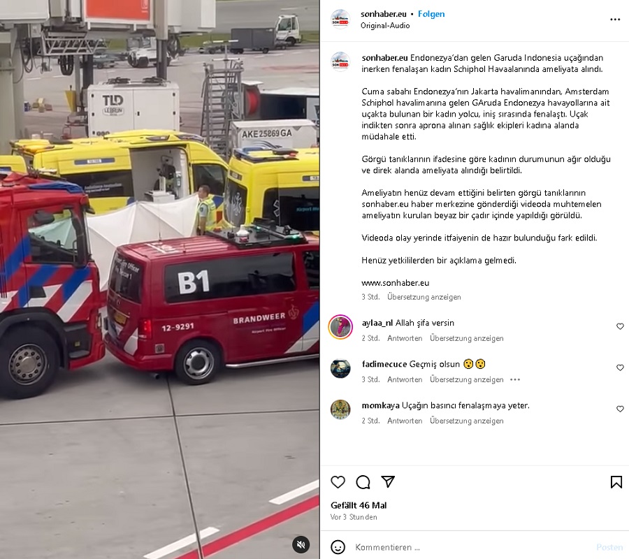 Cuma sabahı Endonezya’nın Jakarta havalimanından, Amsterdam Schiphol havalimanına gelen Garuda Endonezya havayollarına ait uçakta bulunan bir kadın yolcu, iniş sırasında fenalaştı. Uçak indikten sonra aprona alınan sağlık ekipleri kadına alanda müdahale etti.