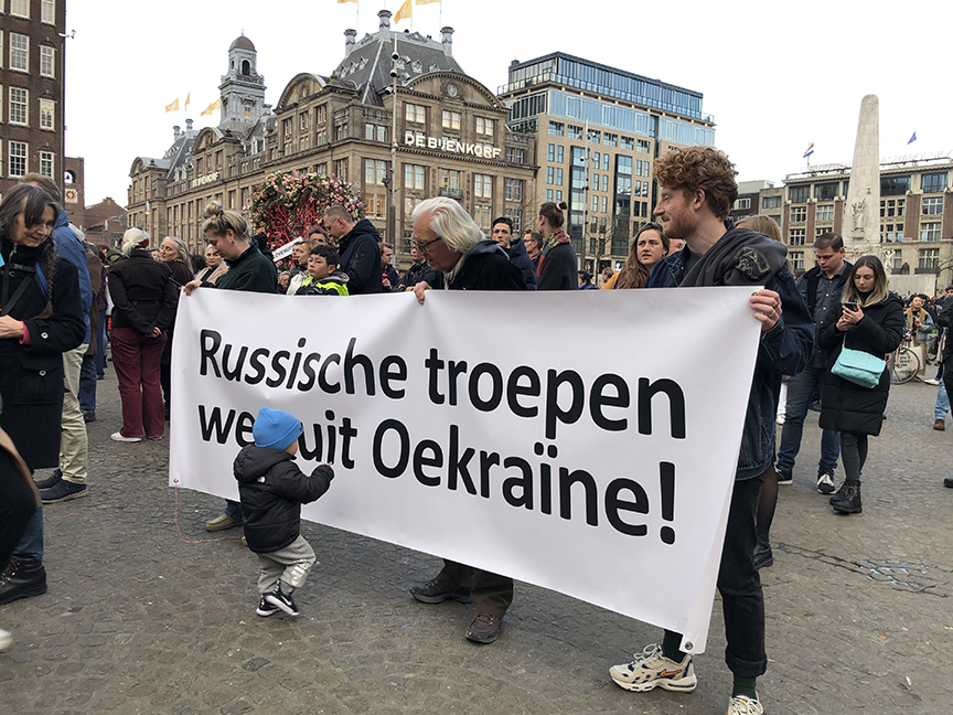 Amsterdam'ın yanı sıra Rotterdam, Lahey, Tilburg, Den Bosch şehirlerinde yapılan gösterilerde Rusya'nın Ukrayna topraklarına saldırıları kınandı.