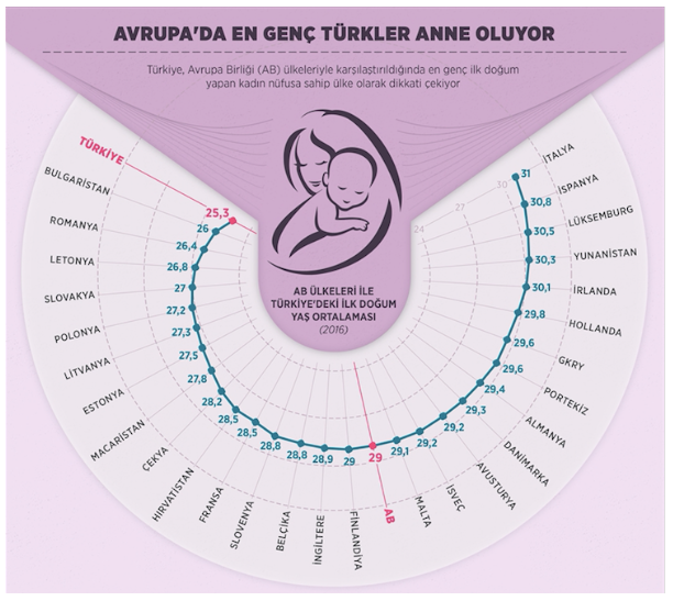 Avrupa İstatistik Ofisi (Eurostat) ve Türkiye İstatistik Kurumu (TÜİK) verilerinden derlenen bilgilere göre, Türkiye'de ilk canlı doğum yapan kadınların ortalama yaşı 25,3'te bulunuyor. AB üyesi ülkelerde ise ilk canlı doğumda ortalama yaş 29'u buluyor. Türkiye, AB üyesi 28 ülke ile karşılaştırıldığında kadınların en genç ilk doğum yaptığı ülke konumunda yer alıyor.