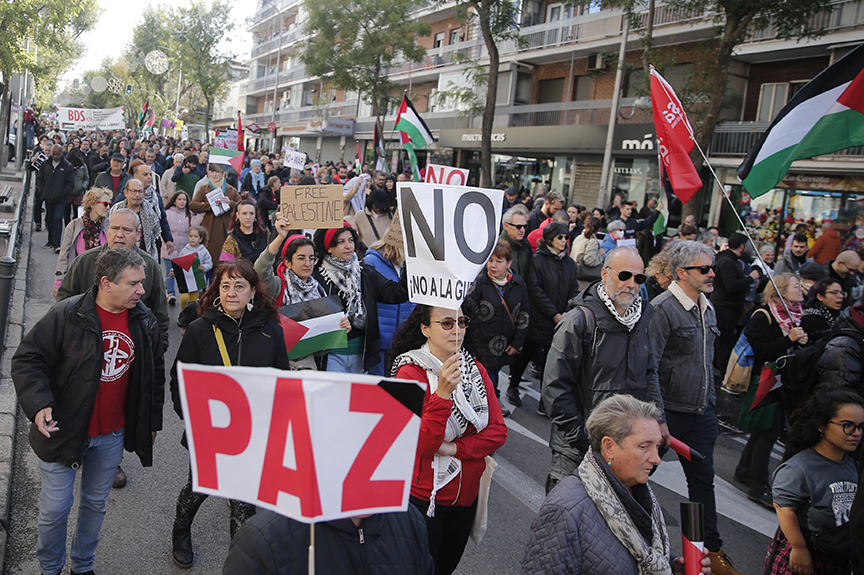 Okunan manifestoda, "Siyonist İsrail devletinin vahşetini ve soykırımını kınamak, Filistin halkının direnişine destek vermek için bugün toplandık. İsrail'in insanlık dışı saldırılarını ve ona destek olan ülkeleri kınıyoruz. İspanyol hükümetinin, tıpkı Bolivya, Kolombiya veya Şili hükümetlerinin yaptığı gibi İsrail ile silah satışını durdurmasını, diplomatik ilişkileri kesmesini istiyoruz." ifadesi yer aldı.