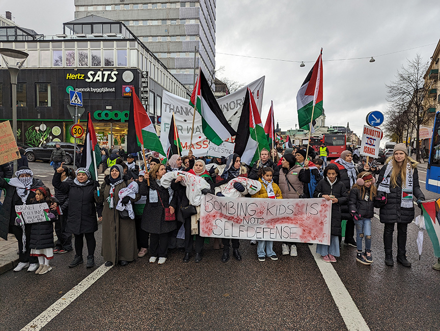 Ülkedeki çok sayıda sivil toplum kuruluşunun çağrısıyla Odenplan bölgesinde toplanan göstericiler, İsrail'in Gazze'ye düzenlediği saldırılara son vermesi, derhal ateşkes ilan edilmesi ve Gazze'ye insani yardım malzemelerinin eksiksiz girişine izin verilmesi çağrısında bulundu.