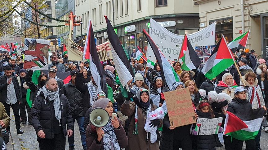 İsveç'in başkenti Stockholm'de binlerce kişi, İsrail'i protesto etmek ve Filistin'e destek vermek için bir araya geldi.