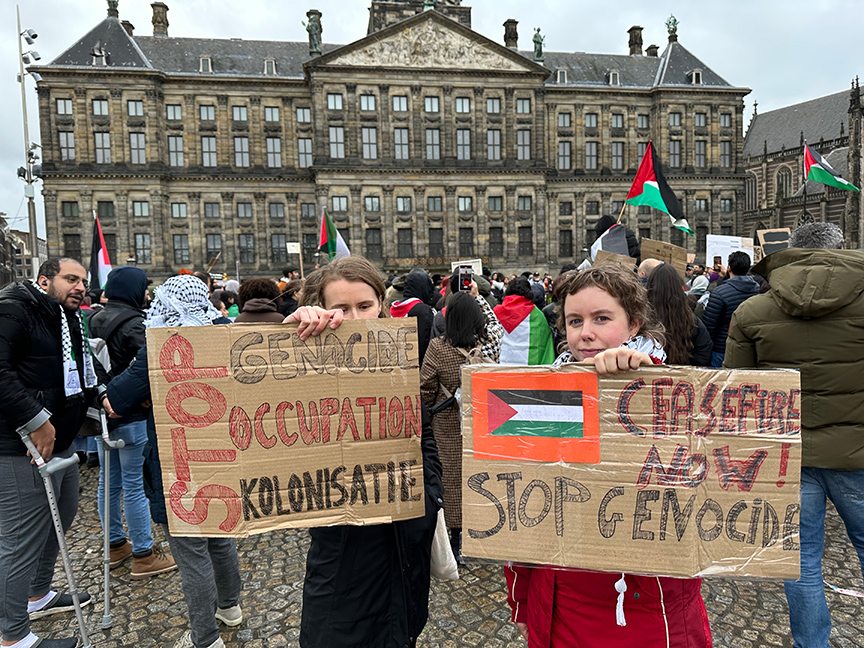 Olumsuz hava koşullarına rağmen başkent Amsterdam'daki Dam Meydanı'nda toplanan yüzlerce kişi, Filistin halkıyla dayanışma içinde olduklarını dile getirdi, başta Hollandalı siyasetçiler olmak üzere AB ve ABD’nin İsrail'i desteklemesini eleştirdi.