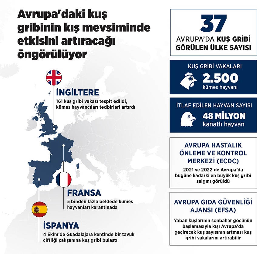 Portekiz'den Norveç'in kuzeyine ve Ukrayna'ya kadar tüm kıtada 37 ülkede 2 bin 500'e yakın kuş gribi vakası görülürken kuş gribi nedeniyle geçen yılın sonbaharından bu yana yaklaşık 48 milyon kanatlı hayvan itlaf edildi.