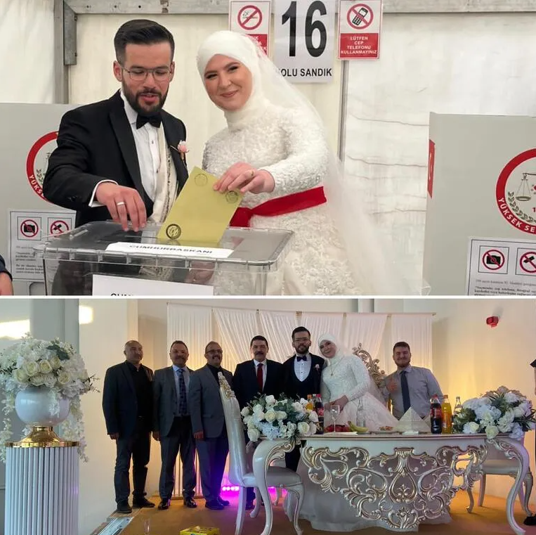 Oy kullanma işleminin hafta sonu başlaması ve oy kullanma süresinin kısa olması nedeniyle Almanya’da aynı gün düğünü olan bazı yeni çiftler gelinlik ve damatlıklarıyla oylarını kullandı. Köln’de yaşayan Çelik Ailesi’nin kızları Şeyda Çelik ile Siegen kenti yakınlarında bulunan Haiger kasabasında yaşayan Erol Ailesi’nin oğulları Yunus Emre Erol’un dün düğünleri vardı. Şeyda Çelik ile Yunus Emre Erol, en mutlu günlerinde gelinlik ve damatlıkla Köln Başkonsolosluğu’na giderek oylarını kullandı. Oy kullanma salonunda bulunan UID Genel Başkanı Köksal Kuş ve görevliler genç çifti tebrik etti. Yine Köln’de düğünleri olan Beyza ile Batuhan Yılmaz çifti de aynı şekilde gelinlik ve damatlığı ile oylarını kullandıktan sonra düğün salonunun yolunu tuttu.