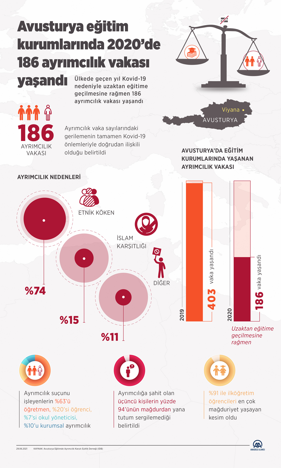 Raporda, Avusturya eğitim kurumlarında bireylerin yüzde 74’le en çok "etnik köken" nedeniyle ayrımcılığa maruz kaldığı belirtilirken, bunu yüzde 15 ile İslam karşıtlığının takip ettiği, yüzde 11’nin ise çeşitli nedenlerle mağduriyet yaşadığı ifade edildi.