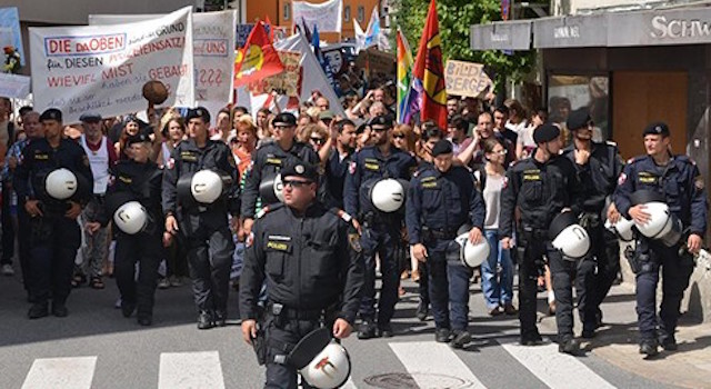 Sayıları sekiz yüz kişiye ulaşan farklı sivil toplum örgütlerinin oluşturduğu "Bilderberg Karşıtları Platformu" üyeleri, toplantısını protesto etmek üzere Telfs şehir merkezinde toplandı.