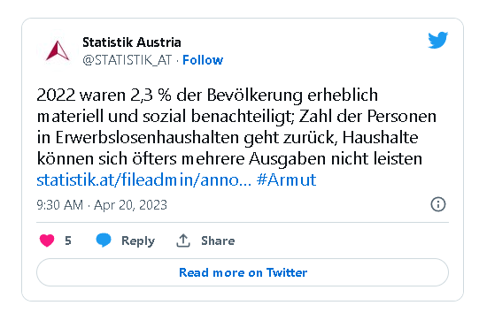 Sosyal Bakan Johannes Rauch (Yeşiller) Avusturya'daki sosyal durumun, enflasyonun son derece yüksek olduğu bir yılda "büyük ölçüde istikrarlı" kaldığını açıkladı. Rauch yaptığı açıklamada "Bu da yardım tedbirlerimizle doğru yolda olduğumuzu gösteriyor" dedi. Ancak Rauch'a göre şu da açık: "Yoksullukla mücadele siyasetin temel görevlerinden biri olmaya devam ediyor. Yoksulluk içindeki her bir kişi, bir kişi fazla".