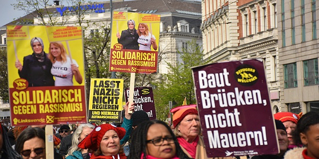 Adalet Bakanlığı önünde toplanan ırkçı, mülteci ve Müslüman karşıtı "Kimlikçiler Hareketi" üyesi yaklaşık 150 kişinin gösterisine karşılık, ırkçılık karşıtı 2 binin üzerinde kişi de Viyana Üniversitesi önünde "Irkçılığa karşı ayağa kalk", "Nazilere hayır", "Irkçılık ve Faşizme karşı omuz omuza" yazılı pankartlar taşıyarak gösteri düzenledi.