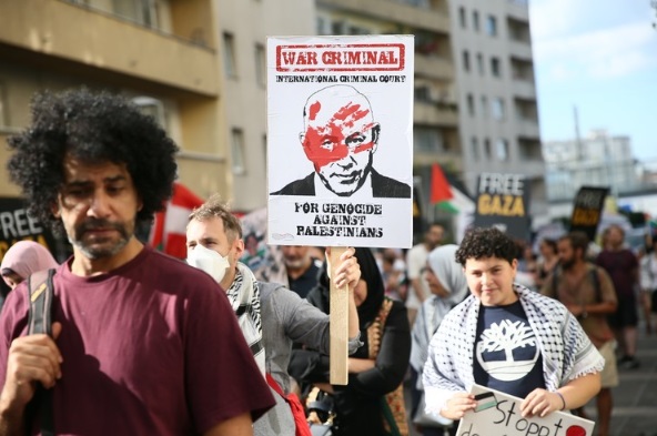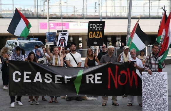Viyana'da yabancıların yoğunlukta olduğu 10'uncu bölgedeki Kültürler Meydanı'nda toplanan göstericiler, Filistin bayraklarının yanı sıra "Hemen ateşkes", "Soykırıma hayır", "Terörist İsrail" yazılı pankartlar taşıdı.