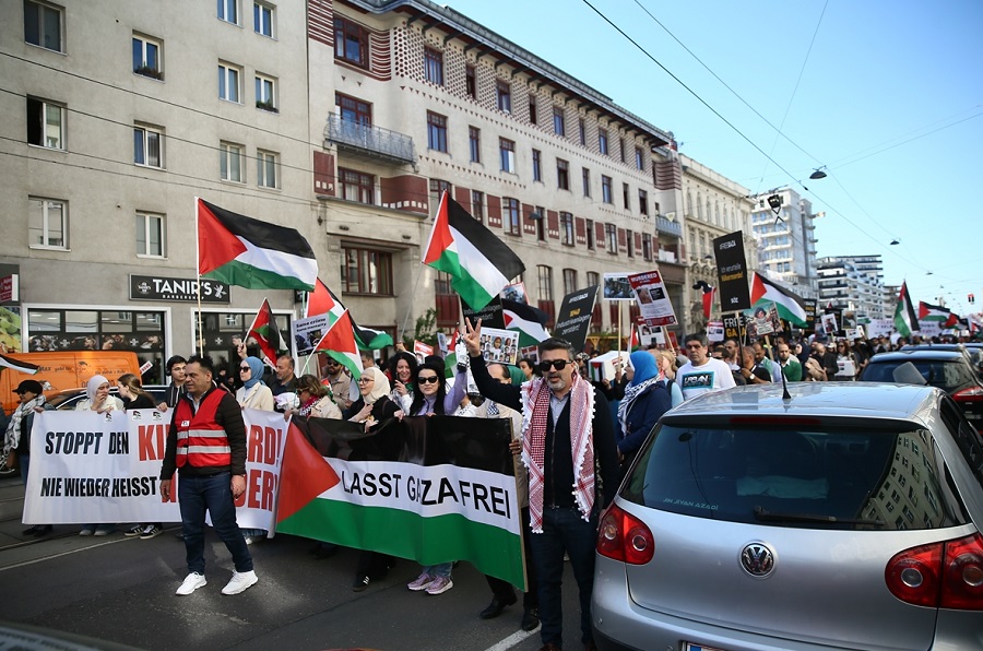 Viyana'nın 10'uncu bölgesindeki Kültürler Meydanı'nda toplanan göstericiler, Filistin bayraklarının yanı sıra "Soykırıma hayır", "Acil ateşkes", "Gazze’ye özgürlük" yazılı pankartlar açtı.
