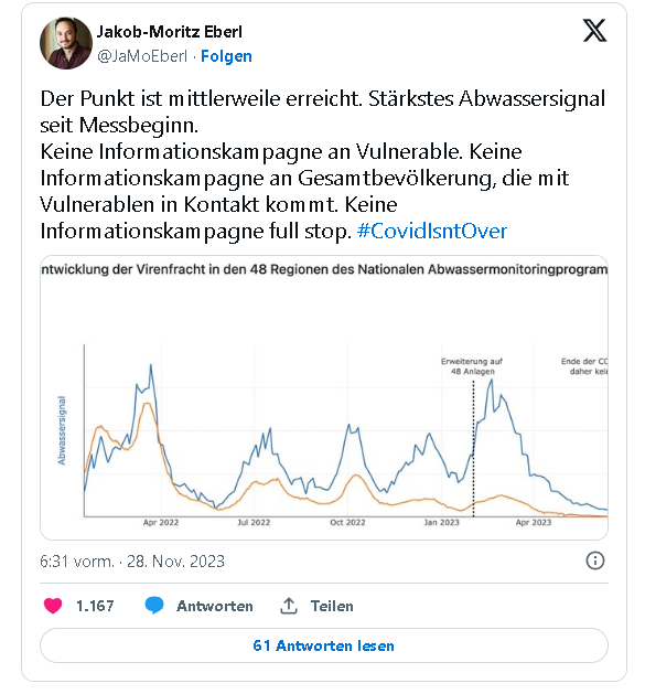 İki hafta önce moleküler biyolog Ulrich Elling, X'teki rekor koronavirüs seviyeleri konusunda uyarıda bulunmuştu: Avusturya "şimdiye kadarki en yüksek Covid dalgalarından birine" doğru ilerliyor diye uyarıda bulunmuştu. Aynı eğilim İsviçre gibi diğer bazı Avrupa ülkelerinde de görülebilir. Elling'e göre, "yeni aşılanmış olmak, maske takmak ve dikkatli olmak" tavsiyesinde bulundu.