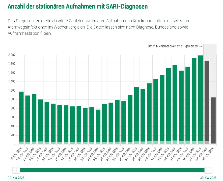 47. takvim haftasında (20-26 Kasım), 1.081 CoV hastası normal servislere kabul edildi. Bundan birkaç hafta önce (44. hafta) yatarak tedavi gören hasta sayısı 772 idi. Bu, yurt içindeki hastanelerde CoV hastalarının sayısının kısa bir süre içinde yaklaşık yüzde %40 oranında arttığı anlamına gelmekte. Buna karşılık, yoğun bakım ünitelerinde yatan kişi sayısı az miktarda değişti - burada karşılık gelen rakamlar 30 (44. hafta) ve 29'dur (47. hafta). Rakamlar her zaman gecikmeli olarak verildiği için daha güncel hastaneye yatış istatistikleri eksik.