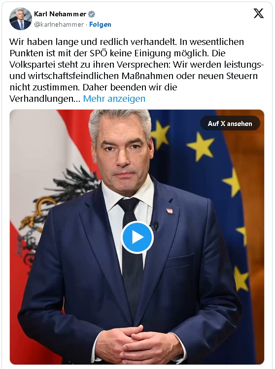 Avusturya’da hükümet krizi derinleşiyor. ÖVP (Österreichische Volkspartei) ve SPÖ (Sozialdemokratische Partei Österreichs) arasındaki koalisyon görüşmeleri başarısızlıkla sonuçlandı. Bu gelişme sonrası Başbakan ve ÖVP lideri Karl Nehammer, görevinden istifa ettiğini duyurdu.