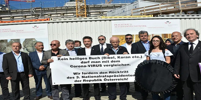 Kendilerini "Bağımsız Türk STK'leri" olarak tanımlayan grup, tarihi parlamento binası önünde, "Hiçbir kutsal kitap (İncil, Kur'an-ı Kerim) yeni tip koronavirüs (Kovid-19) ile kıyaslanamaz, Avusturya Ulusal Meclisinin Üçüncü Başkanı Norbert Hofer'in kullandığı Nazi üslubu nedeniyle istifa etmesini talep ediyoruz." yazılı pankart açtı.