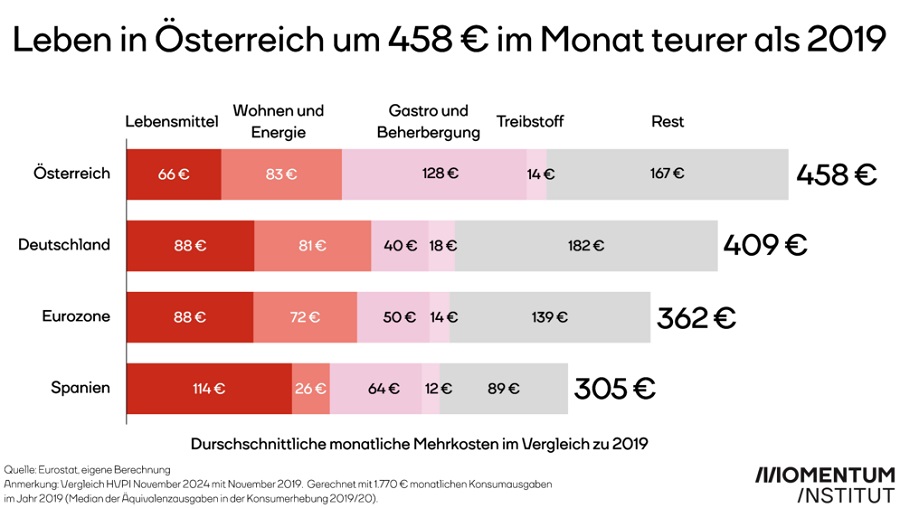 Avusturya’da yaşam maliyetleri son yıllarda ciddi şekilde arttı. Momentum Enstitüsü tarafından yapılan bir analize göre, bir birey 2024 yılı itibarıyla aynı yaşam standardını sürdürebilmek için yıllık ortalama 5.500 Euro daha fazla harcamak zorunda kaldı. Özellikle konut, enerji ve gıda fiyatlarındaki artışlar bu maliyetin en önemli nedenleri arasında yer alıyor.