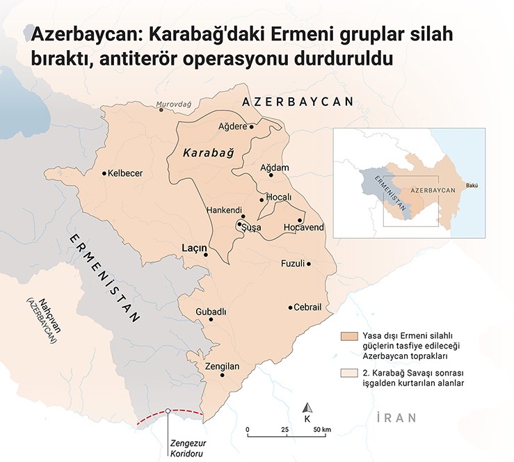 Azerbaycan ordusu, 19 Eylül'de Karabağ'da anayasal düzeni tesis etmek amacıyla antiterör operasyonu başlatmıştı. Karabağ'daki yasa dışı Ermeni silahlı güçler 24 saat süren operasyon sonrasında silah bırakmıştı.