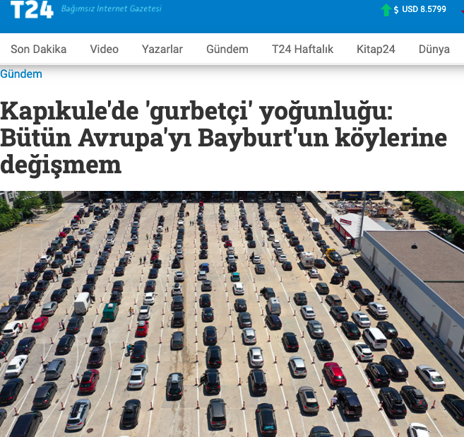 Yılmaz’ın Bütün Avrupa’yı Bayburt’un köyüne değişmem sözünü T24 sitesi “Kapıkule’de ‘gurbetçi’ yoğunluğu: Bütün Avrupa’yı Bayburt’un köylerine değişmem” sözleriyle manşetinden duyurdu.