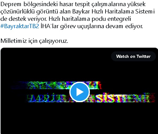 Baykar'ın sosyal medya hesabından yapılan paylaşımda, deprem bölgesindeki hasar tespit çalışmalarına yüksek çözünürlüklü görüntü alan Baykar Hızlı Haritalama Sistemi'nin de destek verdiği belirtilerek, "Hızlı haritalama podu entegreli 'Bayraktar TB2 İHA'lar görev uçuşlarına devam ediyor. Milletimiz için çalışıyoruz." ifadeleri kullanıldı