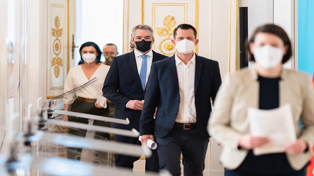Avusturya Başbakanı Karl Nehammer, beraberindeki heyetle düzenlediği basın toplantısında, Kovid-19 salgınına ilişkin yeni kararları kamuoyuyla paylaştı.