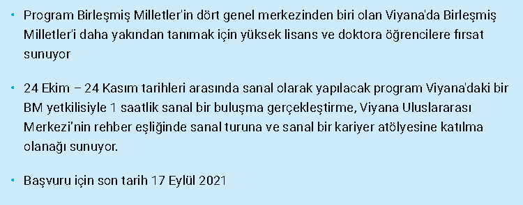 Birleşmiş Milletler’in dünyasını Viyana’daki genel merkezini deneyimleyerek tanımak ister misiniz? Birleşmiş Milletler Viyana Ofisinin her yıl düzenlediği Gölge Programı (Shadowing Programme) 24 Ekim – 24 Kasım tarihleri arasında sanal olarak gerçekleştirilecek. Program öğrencilere bir BM yetkilisiyle 1 saatlik sanal bir buluşma gerçekleştirme, Viyana Uluslararası Merkezi’nin rehber eşliğinde sanal turuna ve sanal bir kariyer atölyesine katılma olanağı sunuyor.