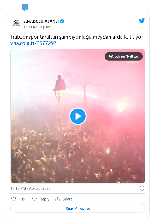 Bazı taraftarlar ise maçı Cumhuriyet Meydanı'nda cep telefonlarıyla takip etti. Maçın bitiş düdüğünden itibaren büyük coşku yaşayan bordo-mavili taraftarlar, tulum eşliğinde tezahüratlarla şampiyonluğu kutladı.