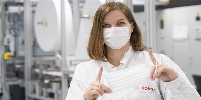 Bosch'tan yapılan açıklamaya göre, Bosch Yönetim Kurulu Başkanı Dr. Volkmar Denner, Stuttgart-Feuerbach'daki Bosch fabrikasında ilk özel yüz maskesi üretim hattını açtı.