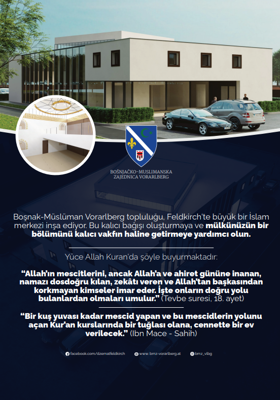 Eyalette ikamet eden 5.000 ile 10.000 arasındaki Boşnak kardeşimizin, her türlü zorluk ve olumsuzluğa rağmen, kısıtlı imkanlarıyla, gerek maddi gerekse manevi fedakarlıklarla ellerini taşın altına koyarak, Vorarlberg eyaletinde ikamet eden Müslümanlara kazandırdığı ve gelecek nesillere kalacak olan bu ibadethaneyi desteklemek ve bu yapıtın hayata geçirilmesine vesile olarak sevabından nasiplenmek isteyen herkese imkan veriliyor.