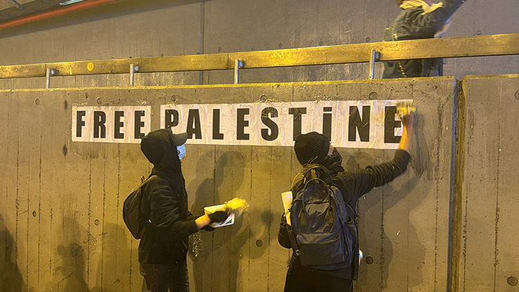 Göstericiler, İngilizce, Fransızca ve Arapça olarak Filistin'e destek, İsrail'e de tepki sloganları attı. İsrail'in Filistinlilere yönelik "soykırımına" tepki gösteren protestocular, Gazze'de yaşanan kıtlık ve özellikle çocukların açlık nedeniyle ölmesine tepki gösterdi.