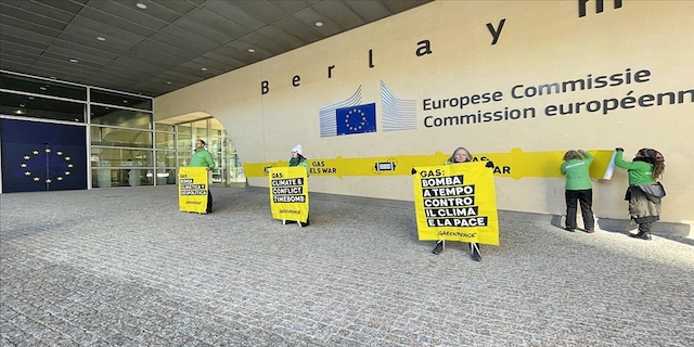 Yeşil mont giyen göstericiler, AB Komisyonu ana girişine gazın savaşı körüklediğine işaret eden ve saatli bomba resmi içeren büyük bir afiş yapıştırdı.