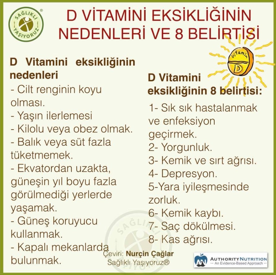 Ancak bağırsakta emilim bozukluğu, kısa bağırsak sendromu ya da midede rahatsızlıklar varsa olumsuz D Vitamini emilimi olumsuz etkilenerek yine ihtiyacı karşılayacak düzeye ulaşamayabiliriz. En önemli miktarın güneş ışınlarıyla sağlandığını belirttik ancak bireyin yaşı, deri rengi, giydiği kıyafet, güneşlendiği saatin yanında güneş ışınları, çevre kirliliği, ozon tabakasındaki değişmeler, yaşanılan ülkenin enlem-boylam değerleri gibi birçok faktör deride D Vitamini aktivasyonunu etkilediğinden ihtiyacın tamamı karşılanmaz. Türkiye’de yapılan çalışmalarda kadın ve erkek farketmeksizin %50 oranında D vitamini eksikliği olduğu saptanmıştır. Bu nedenle yılda en az 1 kez kanda D Vitamini bakılmalı, eksiklik durumuna göre gerekli tedavi planlanmalıdır. Bu sayede tüm dünyada önemli sağlık sorunları olan diyabet, obezite, kanser gibi küresel harcamaların fazla olduğu hastalıklar önlenebilir.