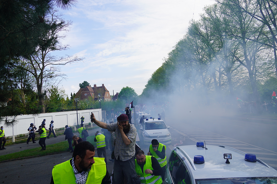 Göstericiler, İsrail Büyükelçiliğinin etrafında oluşturulan polis kordonunun arkasına birkaç kez torpil fırlatmış ve duyulan kuvvetli patlama sesinin ardından harekete geçen Kopenhag polisi, meydanda toplanan kadın ve çocukların da bulunduğu göstericilere göz yaşartıcı gazla müdahale etmişti.